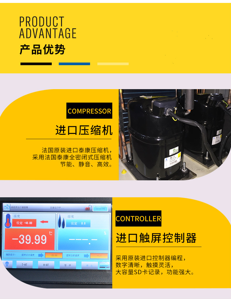 1.采用全進口高精度數(shù)顯溫濕度控制儀表,P.I.D 高精度控制;