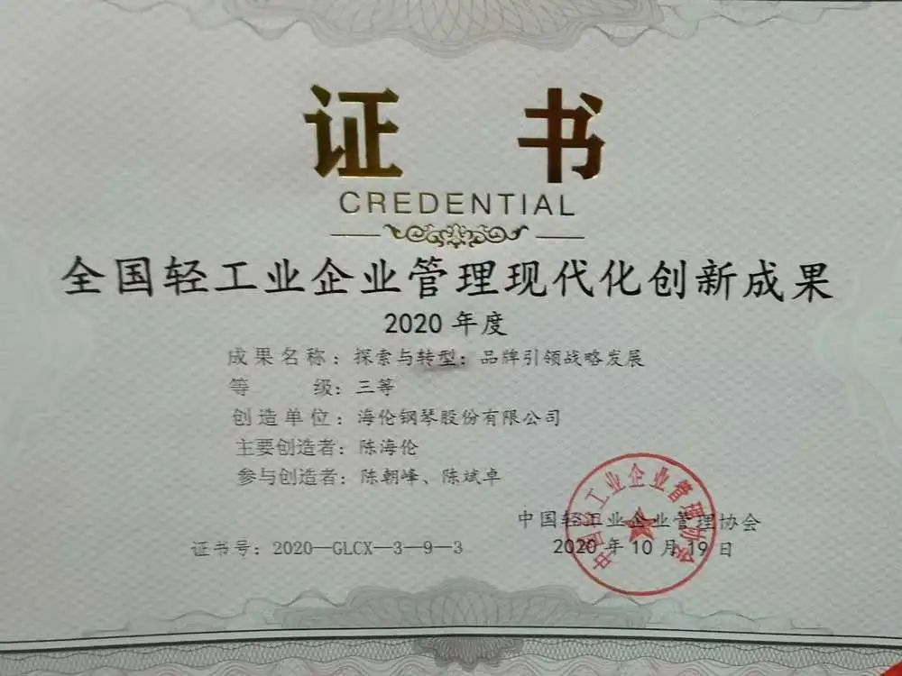 儀式上表彰了2020年全國輕工系統企業所取得的36項創新成果。這些成果是由企業申報后, 經過中國輕工業企業管理協會的嚴格審定,被確定為輕工企業現代化管理的創新成果。 其中海倫鋼琴股份有限公司榮獲”2020年度全國輕工業企業創新管理成果“三等獎。陳海倫、陳朝峰、陳斌卓等海倫鋼琴股份有限公司高層獲得了個人獲獎證書。 這些創新成果展示了中國輕工業系統企業在2020年度中,在戰勝疫情、復工復產,穩定勞動關系,以及生產“智能化“與數字化轉型等方面所取得成果。在大數據應用與平臺經濟發展、品牌培育與質量提升 、產業鏈與網絡整合、集團管控與組織變革、技術創新改造,人力資源管理與激勵機制、綠色發展與社會責任管理等各方面,相關獲獎單位都發揮了重要的作用、獲得了良好的反饋。 本次大會號召,大家要以黨的十九大精神為指引,深入開展管理現代化創新工作,努力挖掘內部潛力,苦練內功。宏揚企業家及工匠精神,在供給側結構性改革中不斷做出新貢獻!