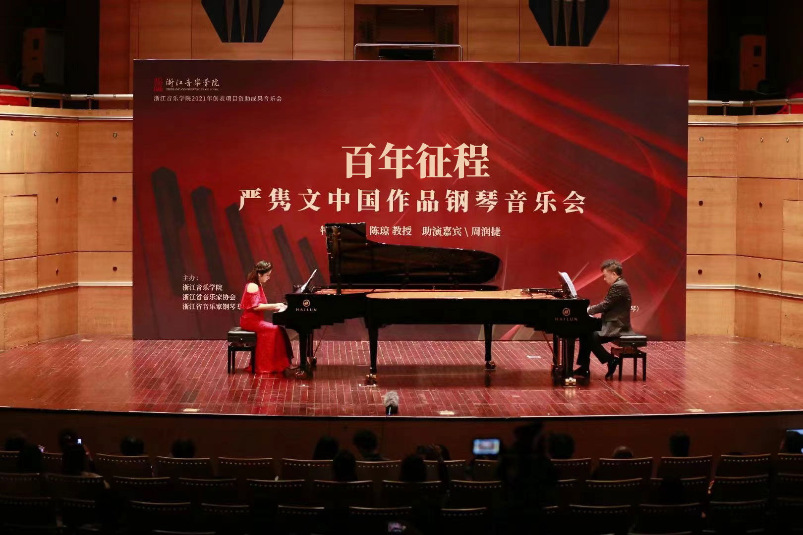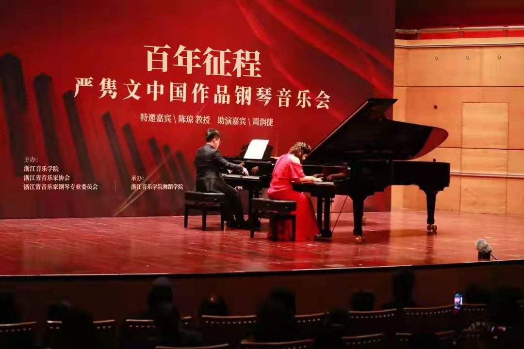 下半場是以鋼琴重奏的形式進(jìn)行,邀請了浙江音樂學(xué)院鋼琴教授陳瓊和研究生周潤捷共同演奏。