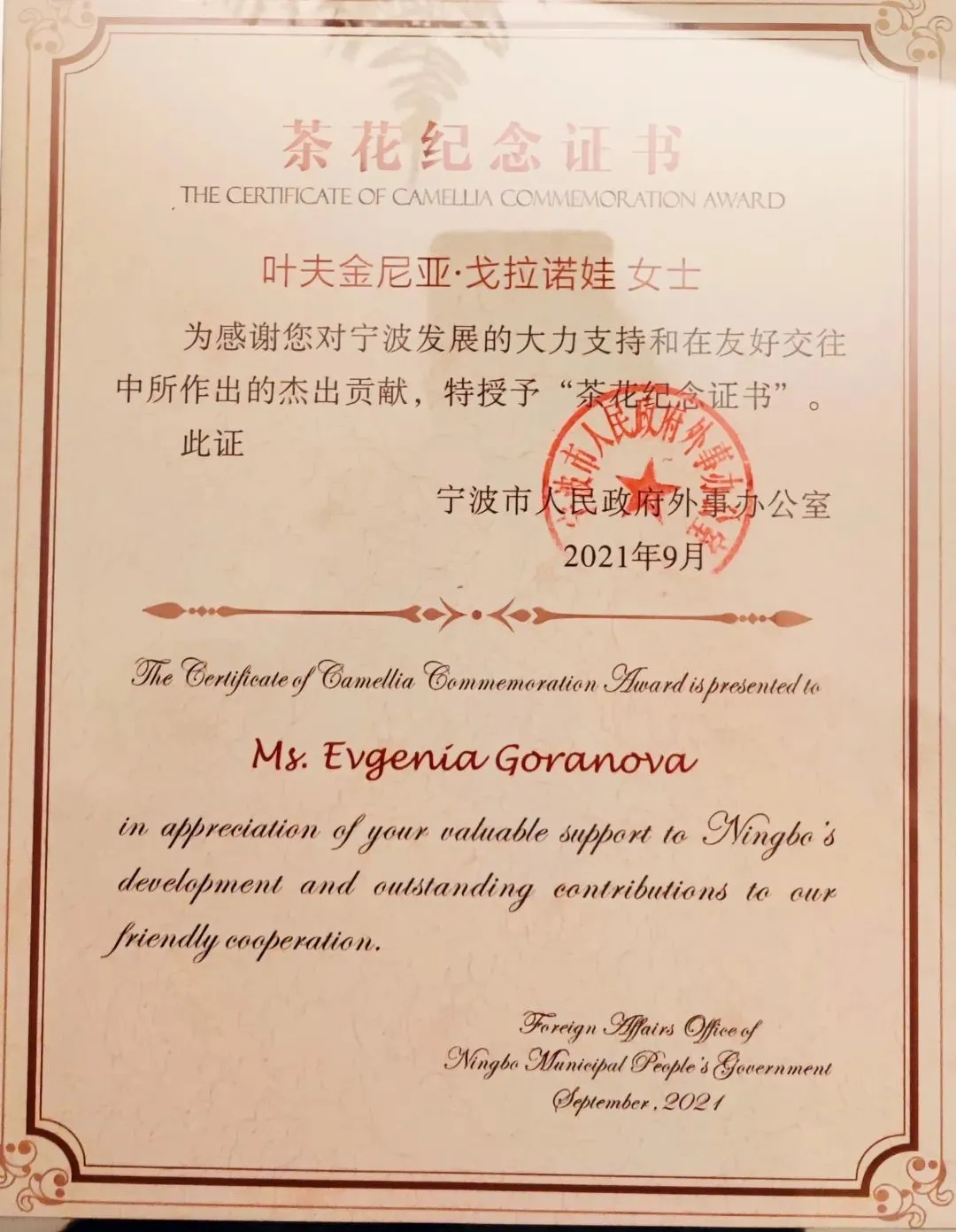 “茶花友誼證書”“茶花紀念證書”是我市專門為對寧波經(jīng)濟建設和社會發(fā)展作出突出貢獻的外國專家設立的。今年,海倫音樂中心葉夫金尼亞·戈拉諾娃等8位在甬外國專家獲得“茶花紀念證書”。