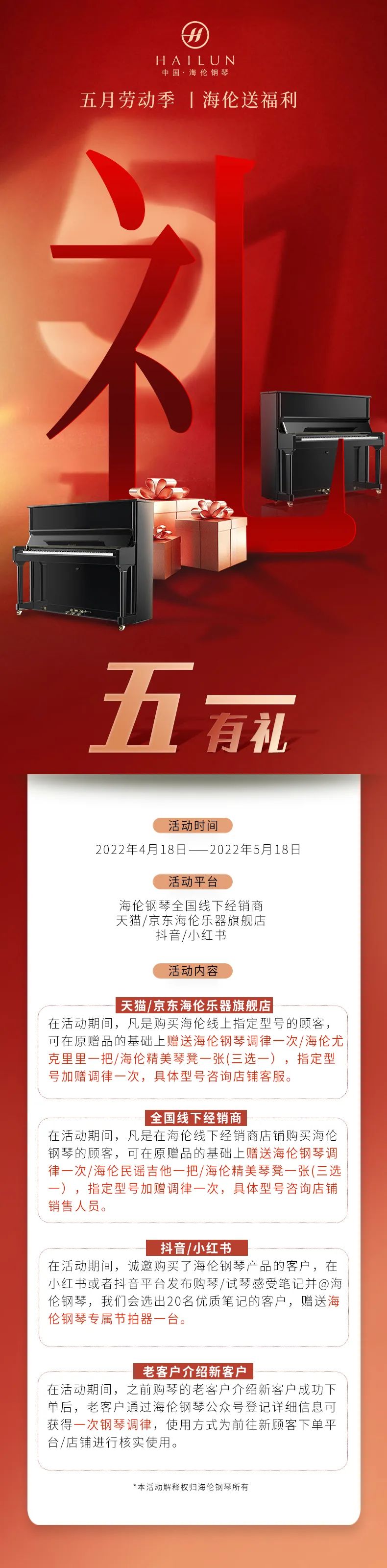 1. 本次活動外除調律外的其他禮品福利,請咨詢當地店鋪銷售或者線上客服獲得。