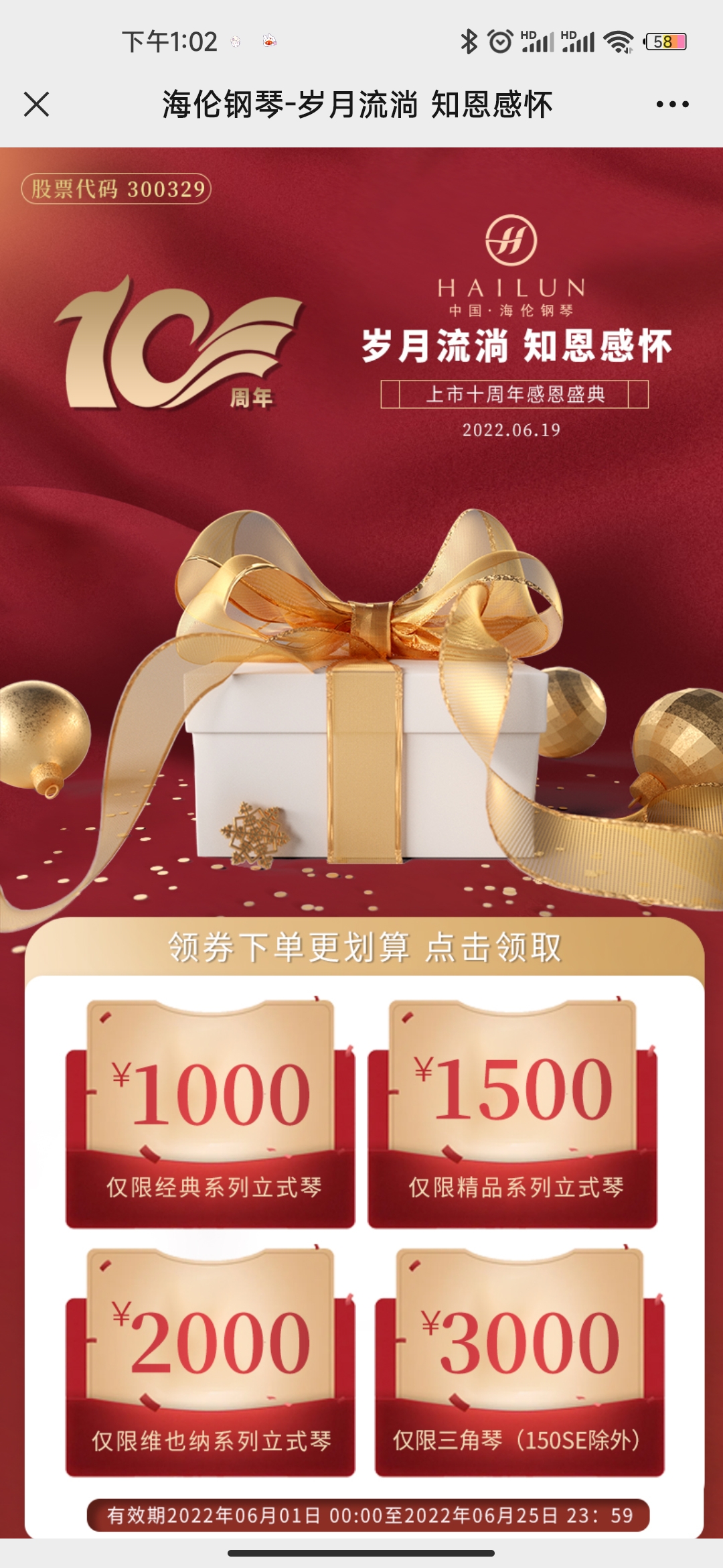 關(guān)注“海倫鋼琴”官方微信公眾號,回復(fù)“上市十周年”,點擊領(lǐng)取福利進(jìn)入領(lǐng)券頁面;