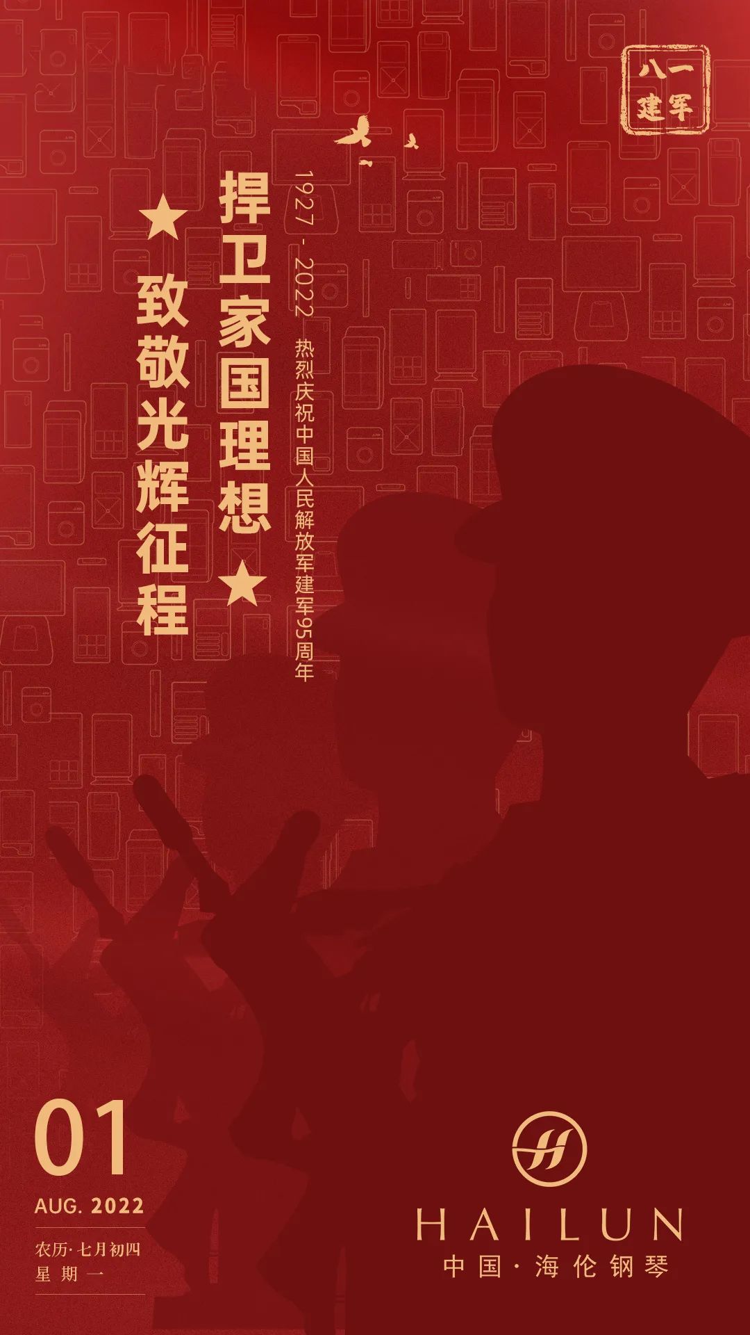 一腔豪情,奏響時代頌歌 一份忠誠,歌頌祖國強大 他們 熱血!堅定!無畏!無悔! 他們,就是中國軍人 今天是八一建軍節 中國人民解放軍成立95周年 海倫鋼琴向 “鋼鐵長城”般的中國軍人致敬