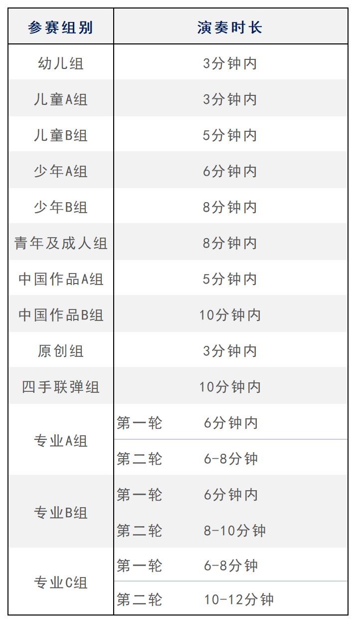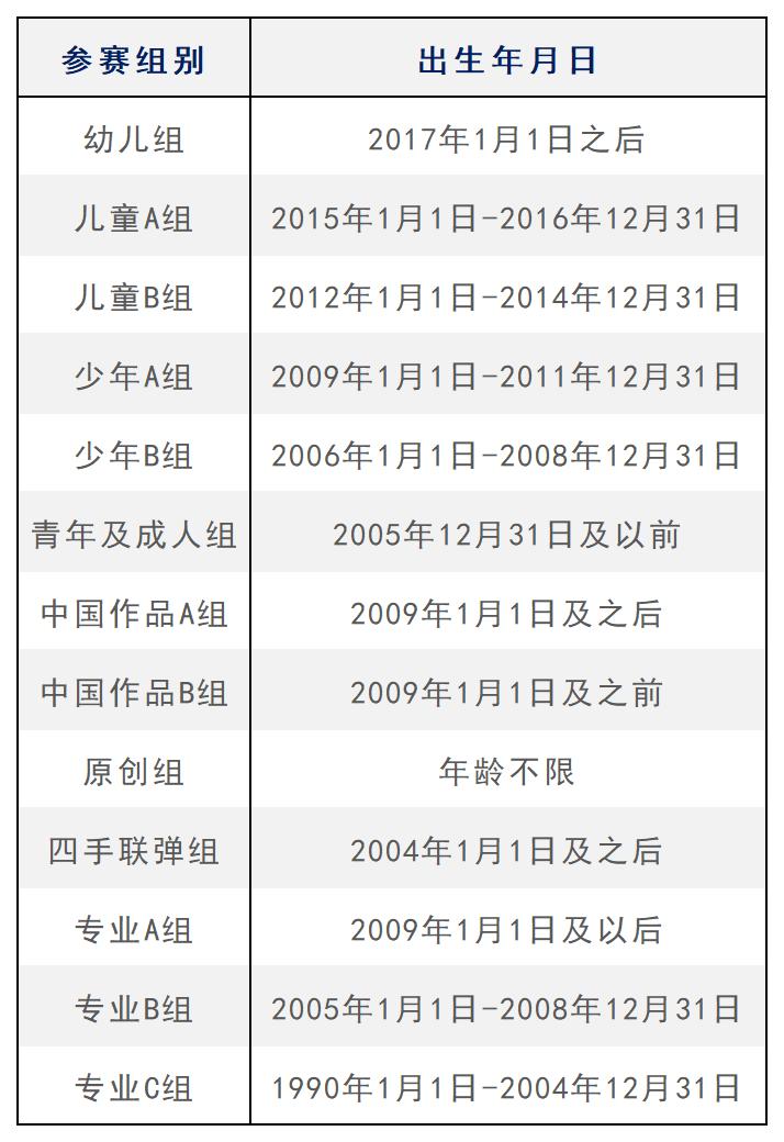 ● 業(yè)余組:幼兒組、兒童A組、兒童B組、少年A組、少年B組、青年及成人組,曲目自選。