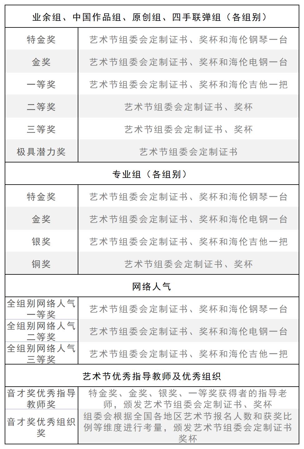 ● 本屆藝術(shù)節(jié)設(shè)置特金獎(jiǎng)、金獎(jiǎng)、銀獎(jiǎng)、一、二、三等獎(jiǎng)等多個(gè)獎(jiǎng)項(xiàng)。專業(yè)組、業(yè)余組、中國作品組、原創(chuàng)組、四手聯(lián)彈組獎(jiǎng)項(xiàng)設(shè)置如下(其中四手聯(lián)彈組獲獎(jiǎng)選手證書或獎(jiǎng)杯為每人一份,其他獲獎(jiǎng)獎(jiǎng)勵(lì)為每組一份)。