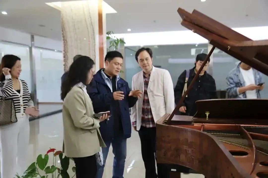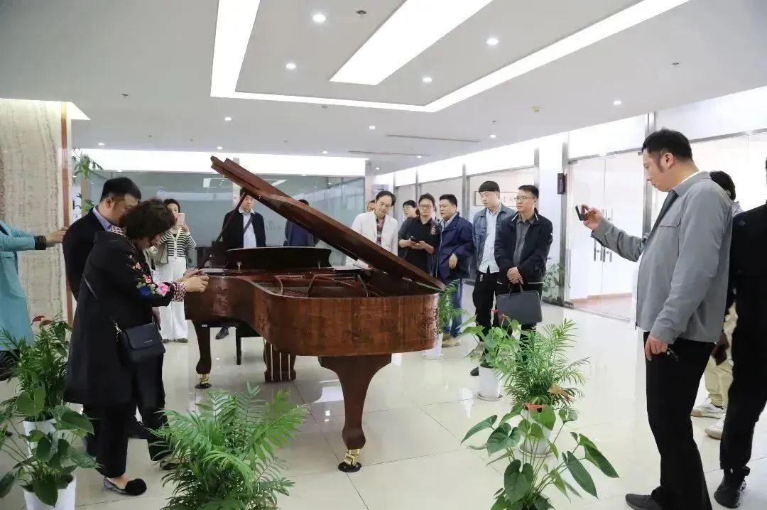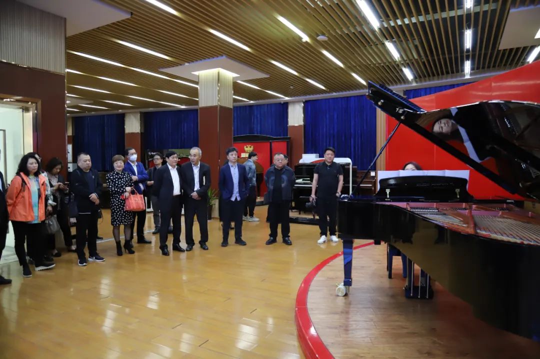 在海倫鋼琴總經理陳朝峰帶隊,海倫藝術教育投資有限公司營運總監張仁博陪同講解下,教育部領導一行參觀了海倫鋼琴生產車間,并駐足欣賞海倫百鳥朝鳳紅木九尺三角琴,對海倫鋼琴的品牌、生產規模、質量管理等方面有了深入的了解。
